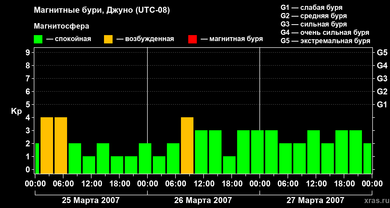 Изменения геомагнитного индекса Kp с 25 по 27 марта 2007 года для средних широт