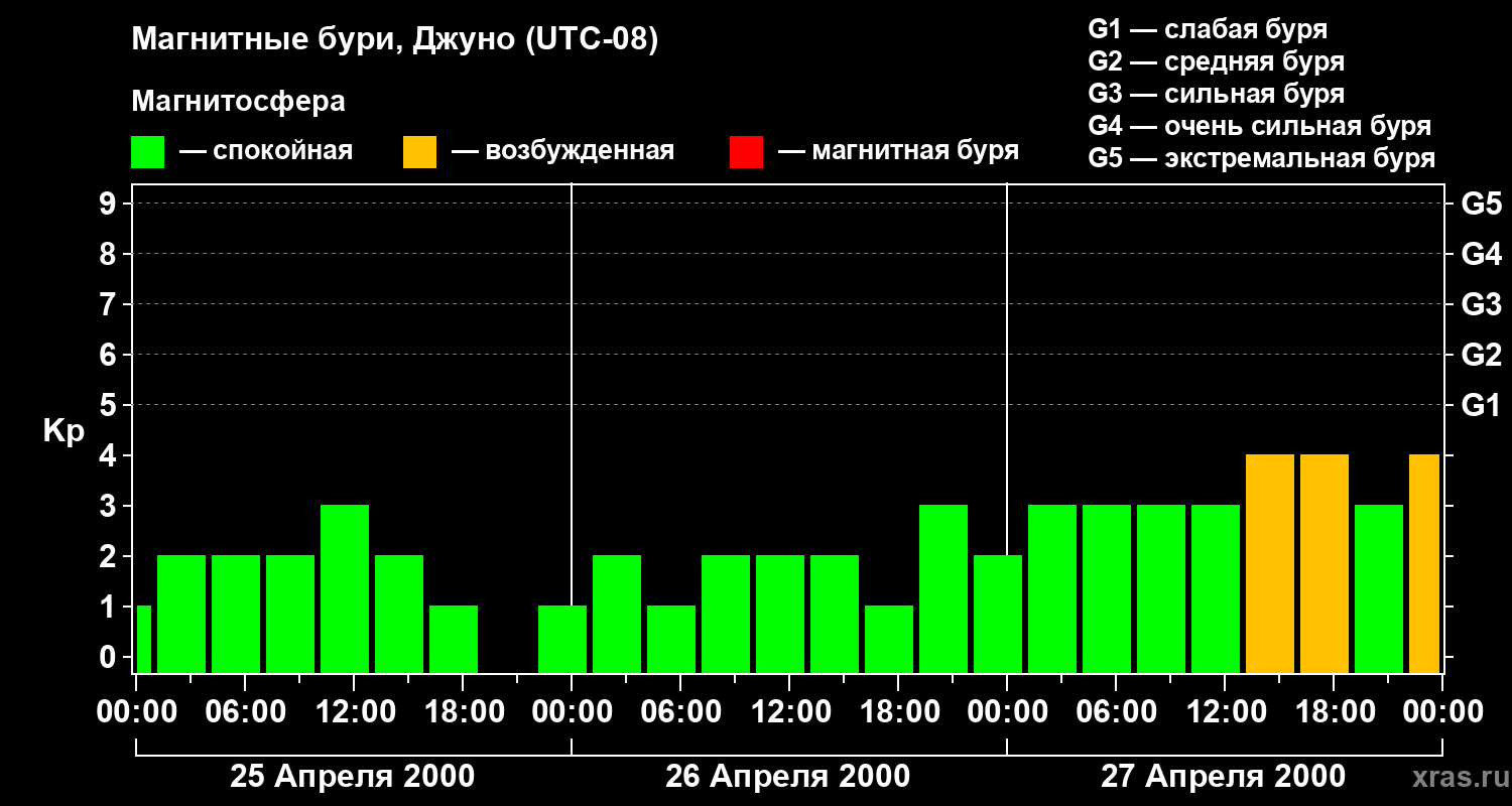 Изменения геомагнитного индекса Kp с 25 по 27 апреля 2000 года для средних широт