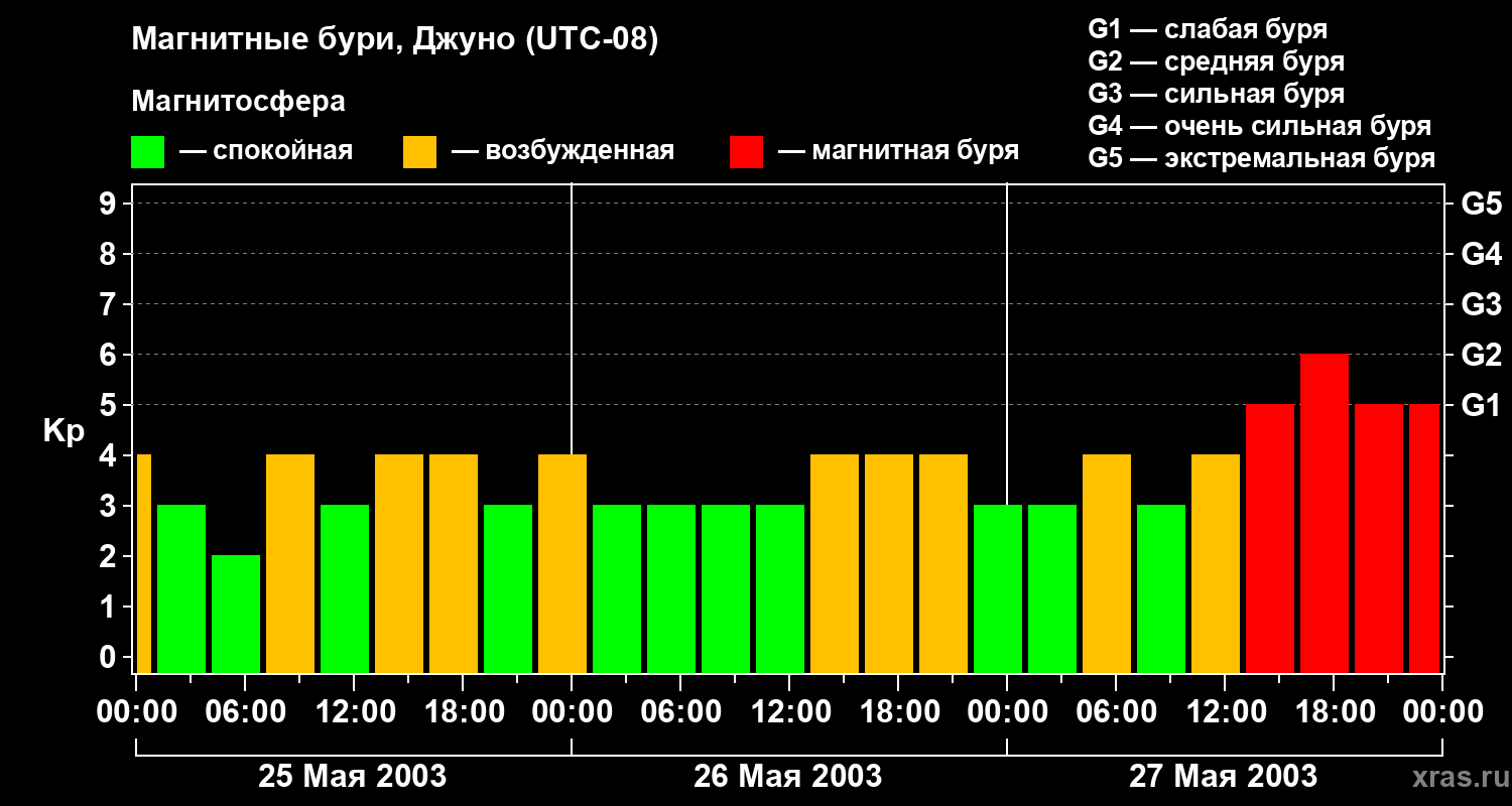 Изменения геомагнитного индекса Kp с 25 по 27 мая 2003 года для средних широт