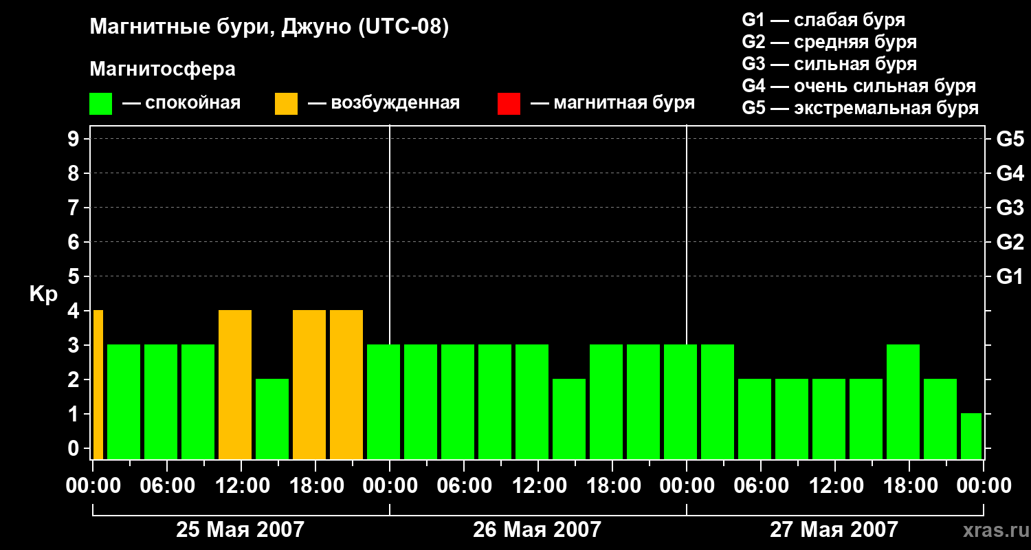 Изменения геомагнитного индекса Kp с 25 по 27 мая 2007 года для средних широт