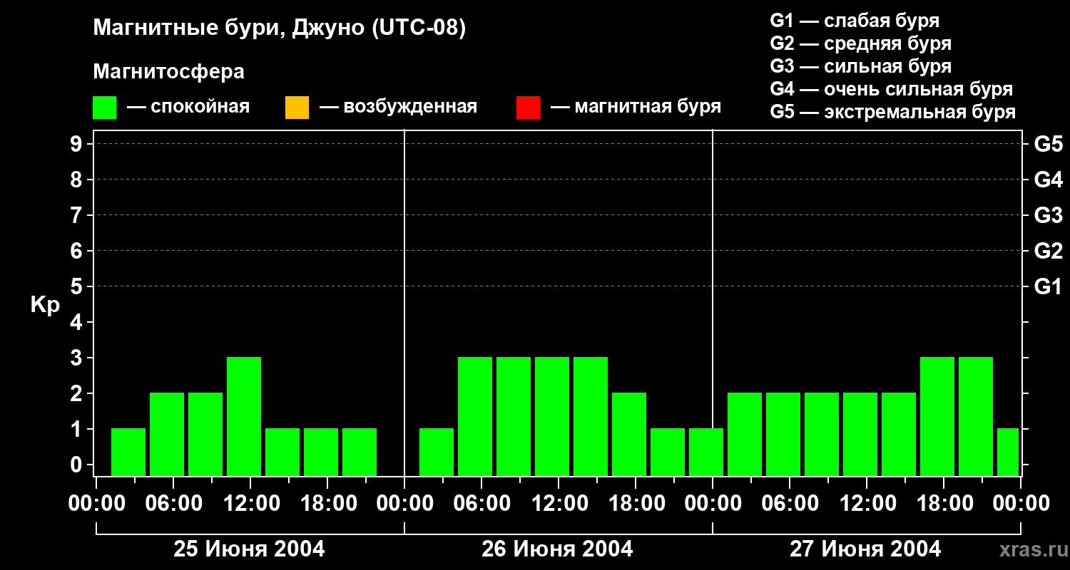 Изменения геомагнитного индекса Kp с 25 по 27 июня 2004 года для средних широт