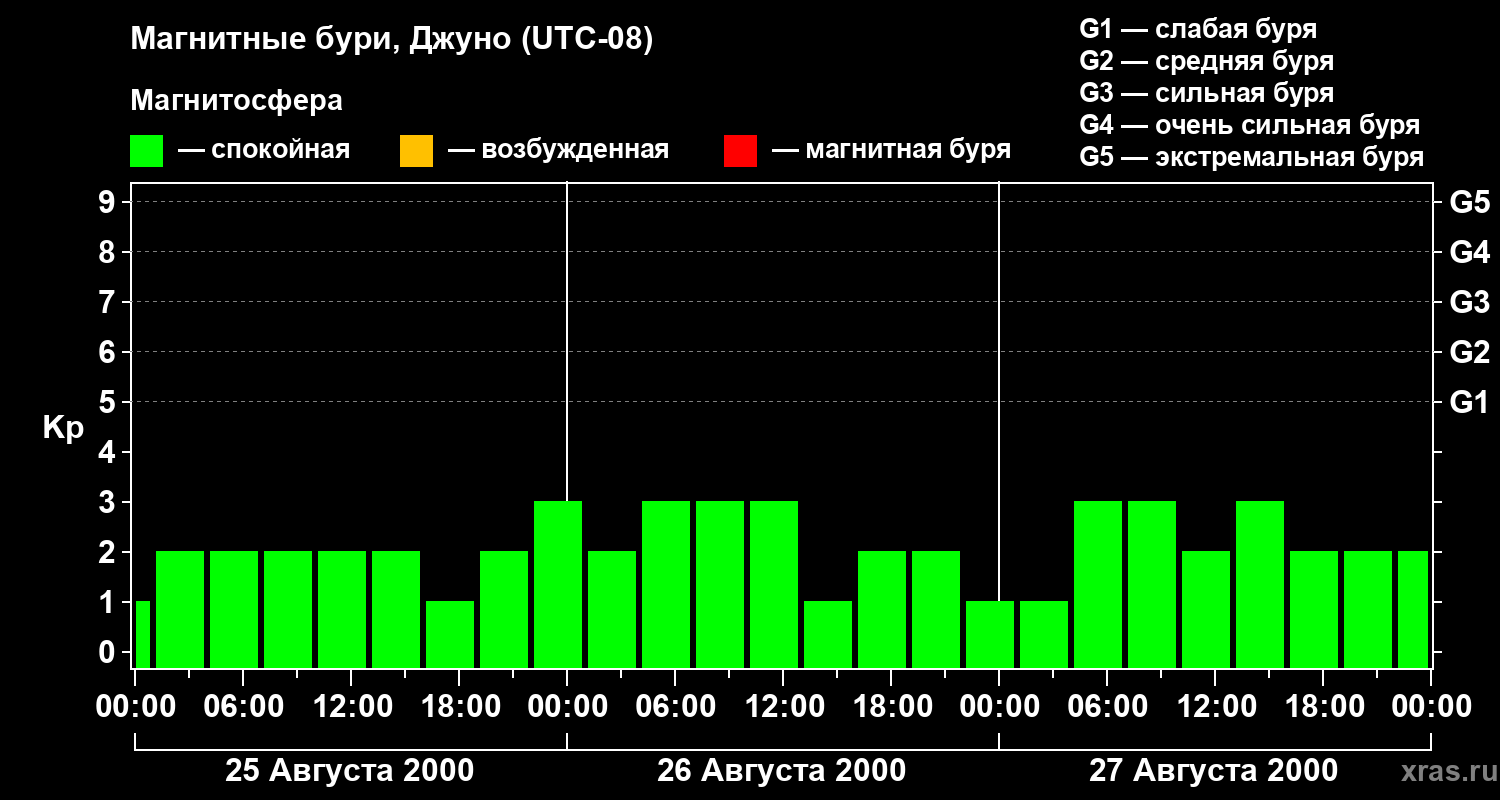 Изменения геомагнитного индекса Kp с 25 по 27 августа 2000 года для средних широт
