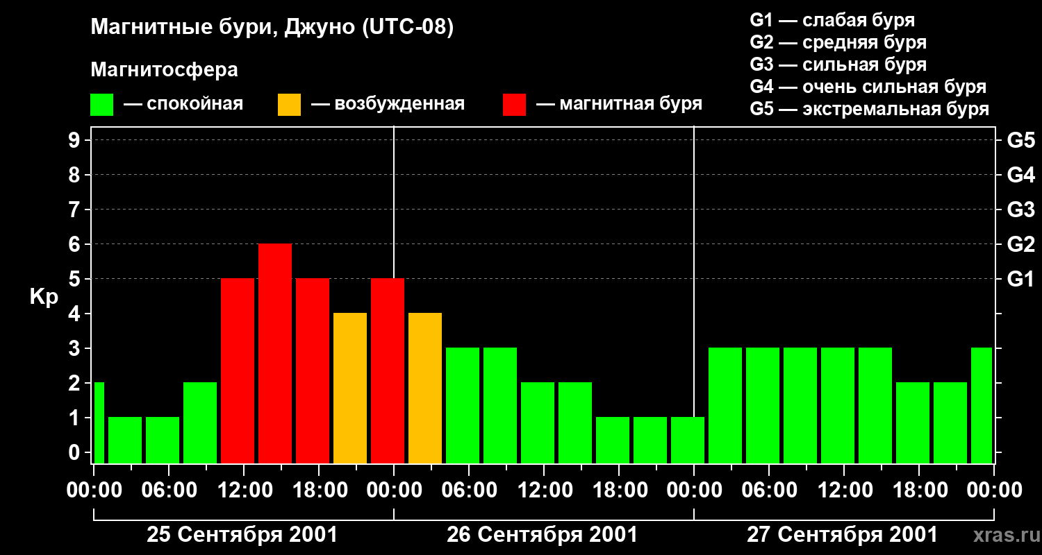 Изменения геомагнитного индекса Kp с 25 по 27 сентября 2001 года для средних широт