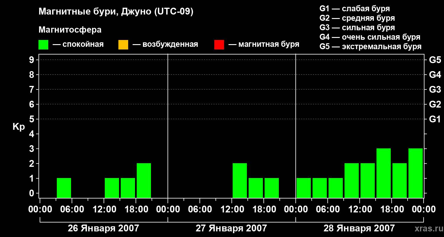 Изменения геомагнитного индекса Kp с 26 по 28 января 2007 года для средних широт