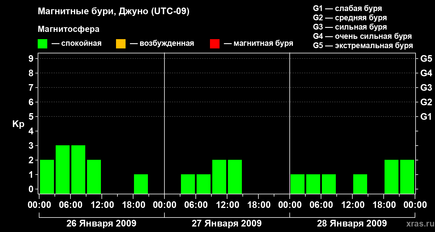 Изменения геомагнитного индекса Kp с 26 по 28 января 2009 года для средних широт