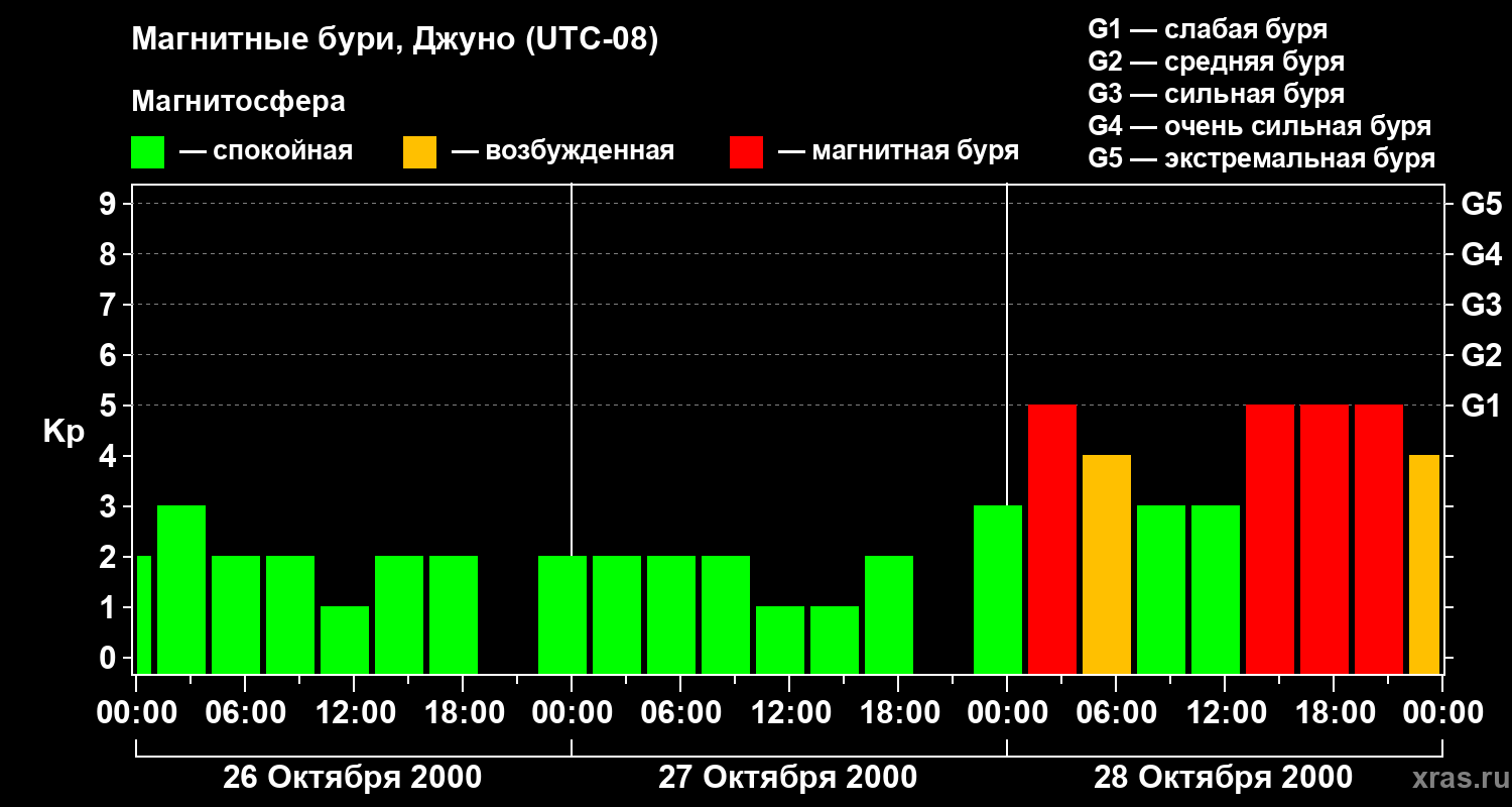 Изменения геомагнитного индекса Kp с 26 по 28 октября 2000 года для средних широт