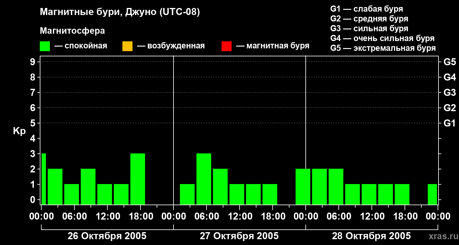Изменения геомагнитного индекса Kp с 26 по 28 октября 2005 года для средних широт