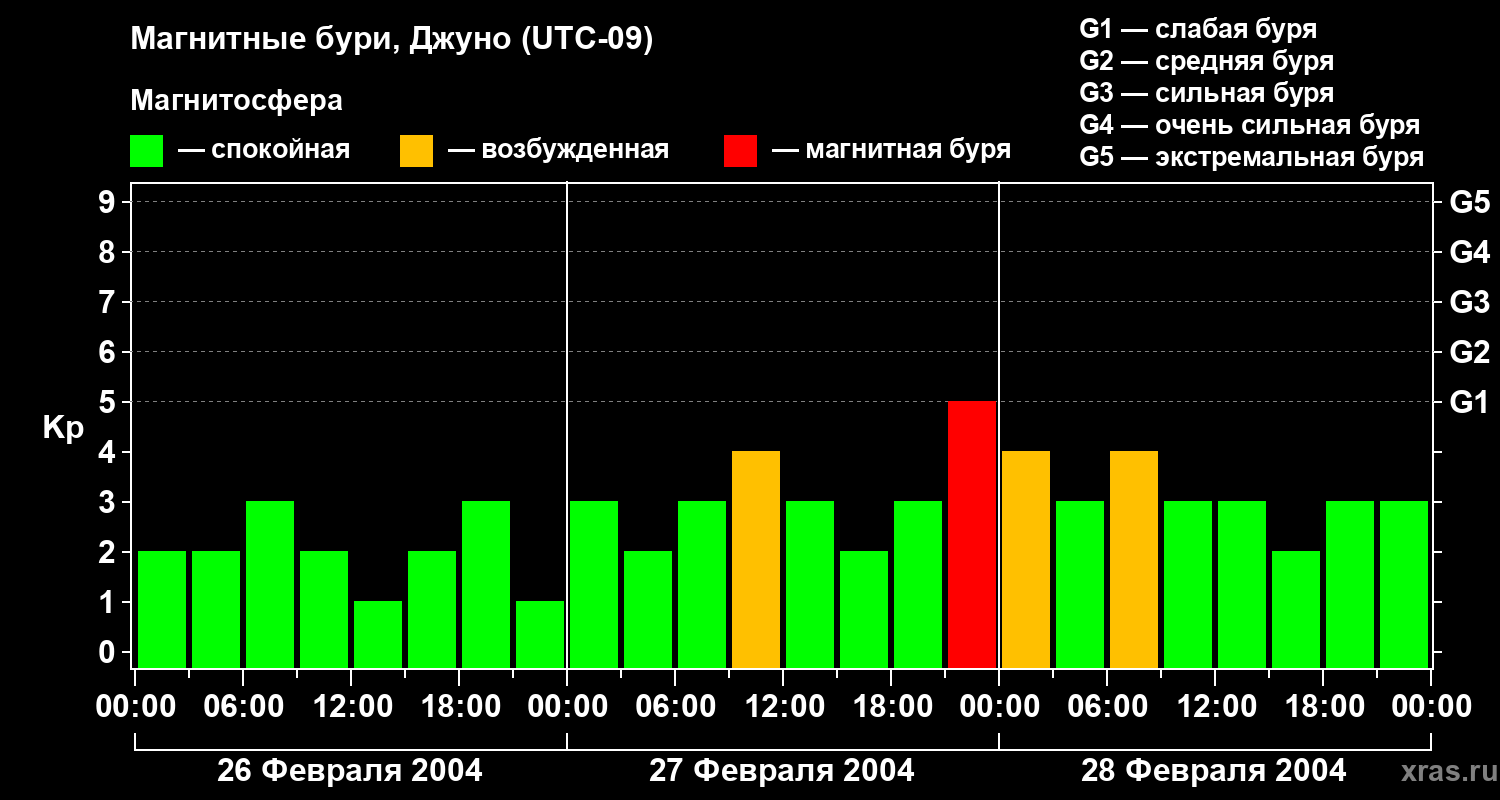 Изменения геомагнитного индекса Kp с 26 по 28 февраля 2004 года для средних широт