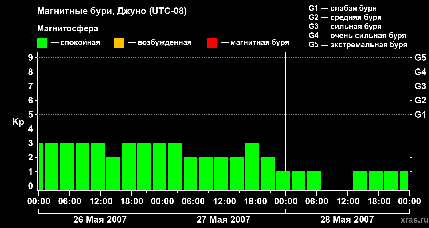 Изменения геомагнитного индекса Kp с 26 по 28 мая 2007 года для средних широт