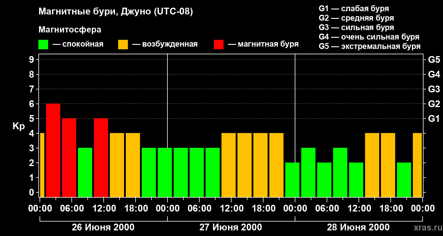 Изменения геомагнитного индекса Kp с 26 по 28 июня 2000 года для средних широт