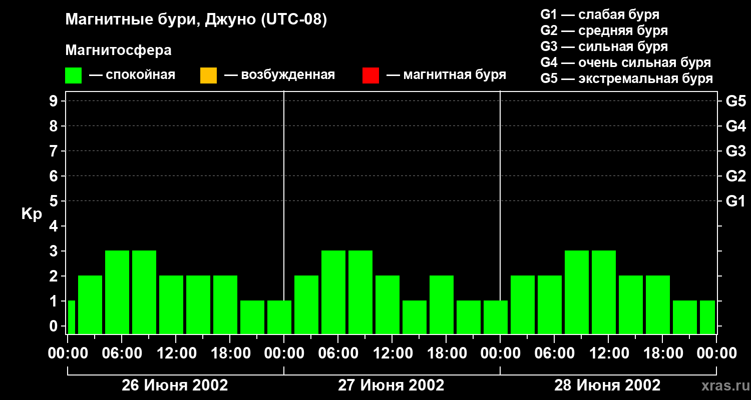 Изменения геомагнитного индекса Kp с 26 по 28 июня 2002 года для средних широт