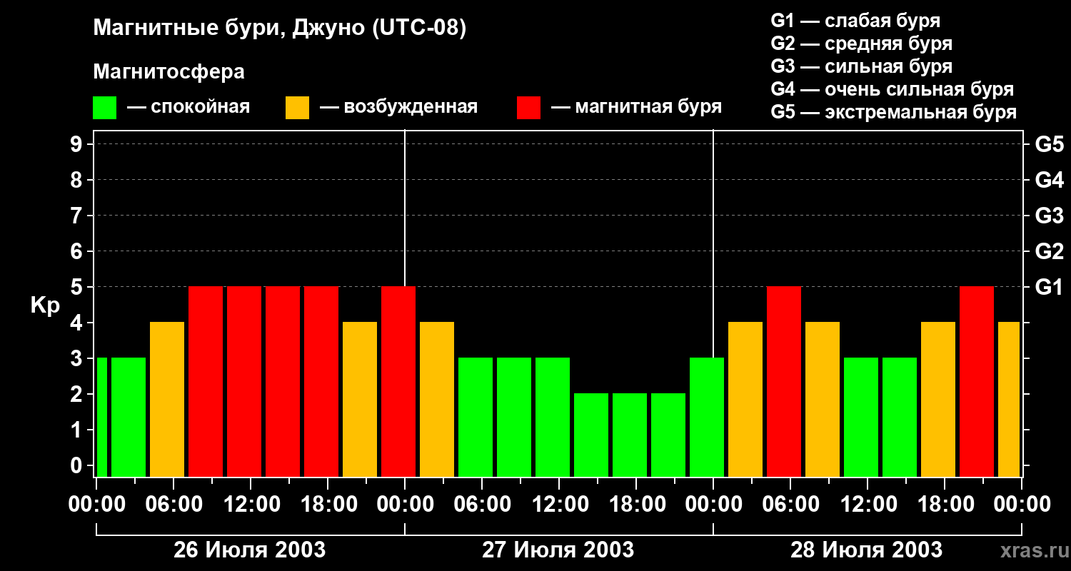 Изменения геомагнитного индекса Kp с 26 по 28 июля 2003 года для средних широт