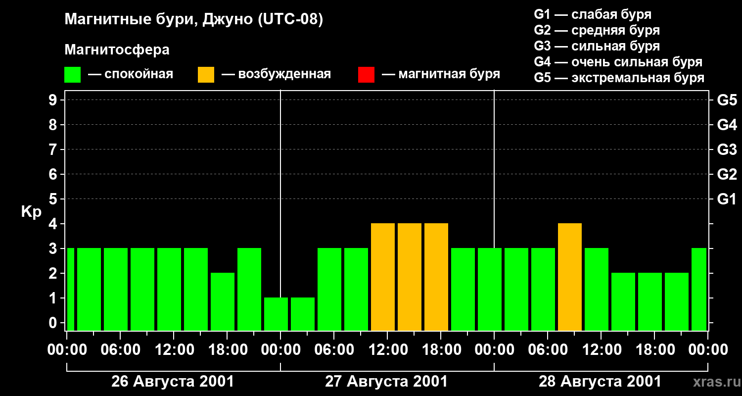 Изменения геомагнитного индекса Kp с 26 по 28 августа 2001 года для средних широт