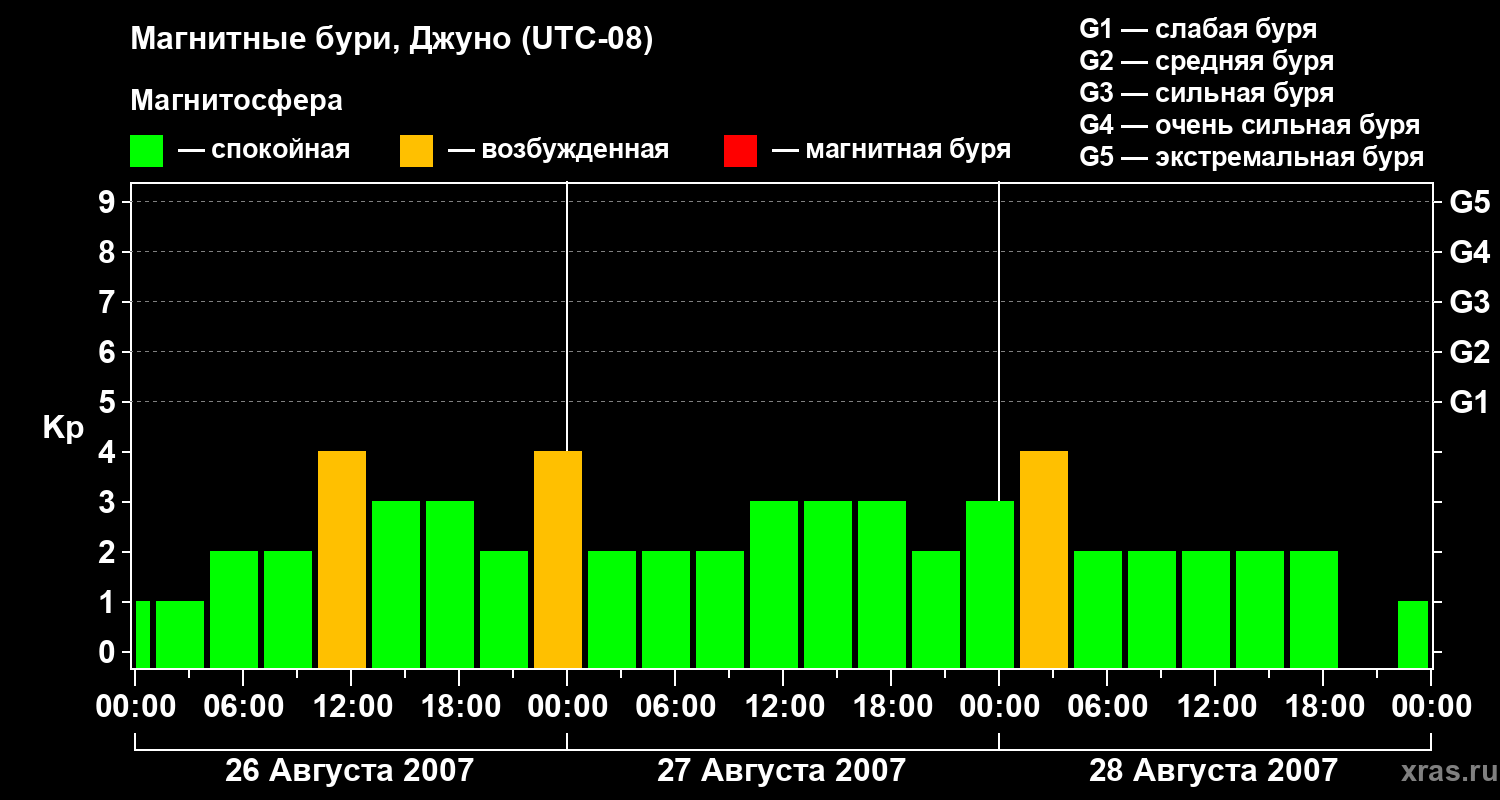 Изменения геомагнитного индекса Kp с 26 по 28 августа 2007 года для средних широт