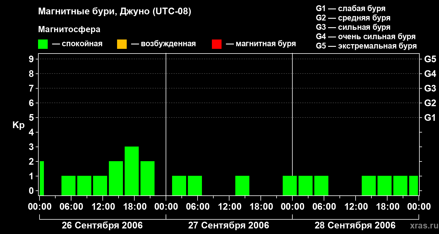 Изменения геомагнитного индекса Kp с 26 по 28 сентября 2006 года для средних широт