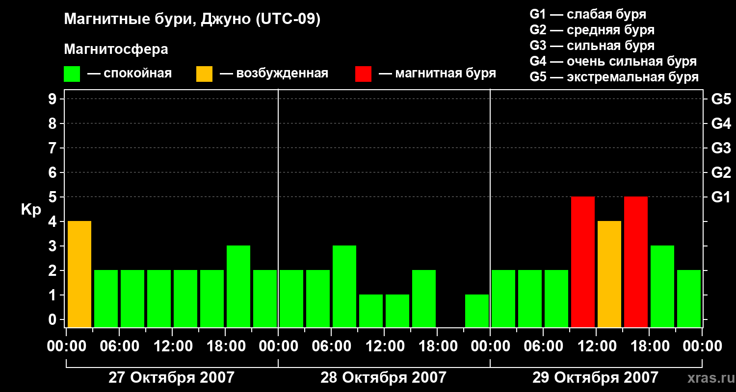 Изменения геомагнитного индекса Kp с 27 по 29 октября 2007 года для средних широт