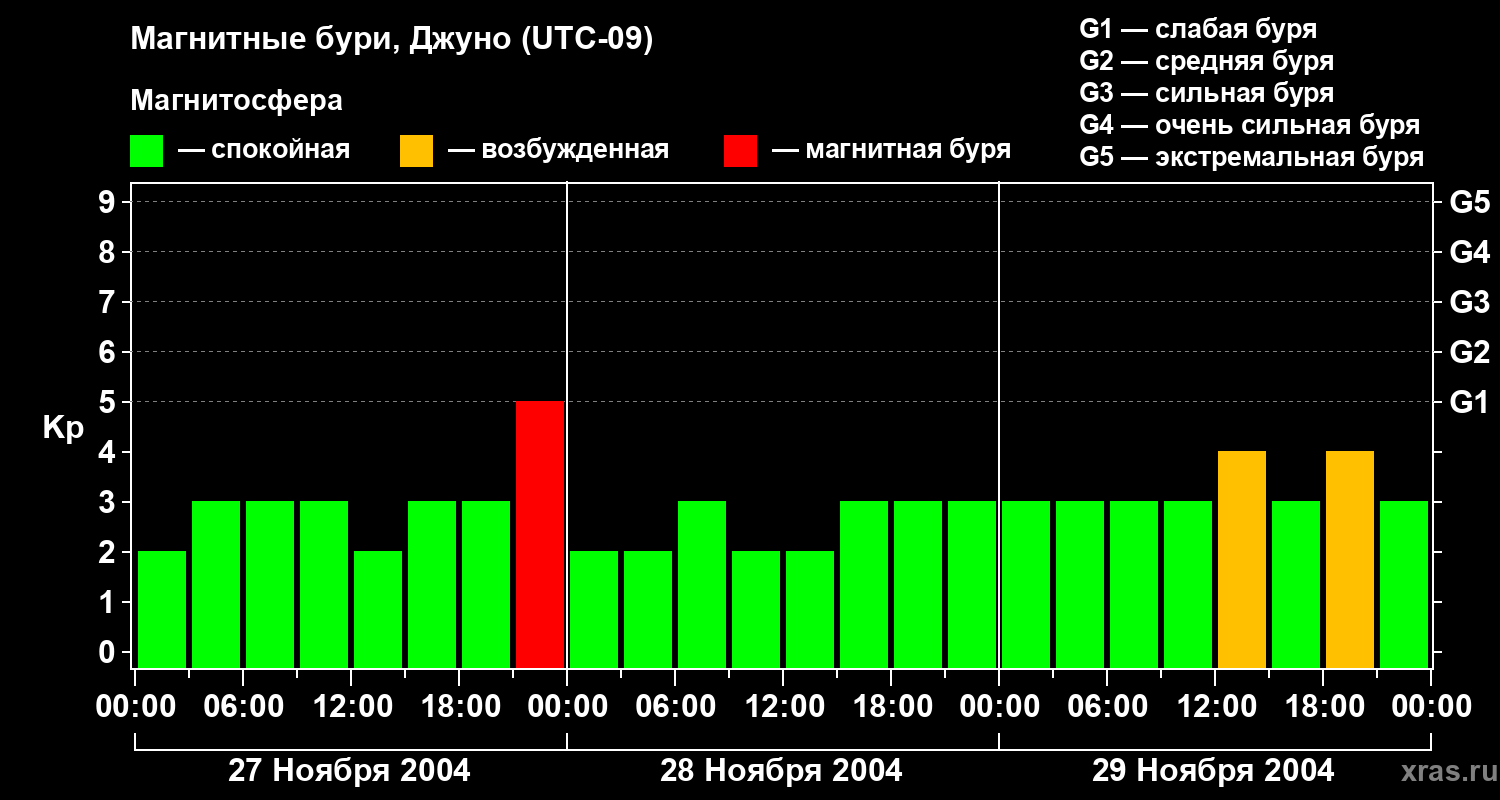 Изменения геомагнитного индекса Kp с 27 по 29 ноября 2004 года для средних широт