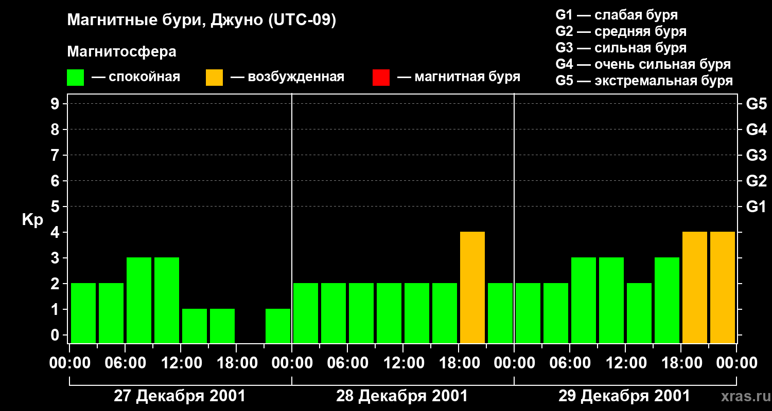 Изменения геомагнитного индекса Kp с 27 по 29 декабря 2001 года для средних широт
