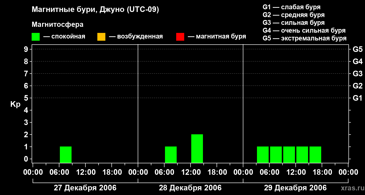 Изменения геомагнитного индекса Kp с 27 по 29 декабря 2006 года для средних широт