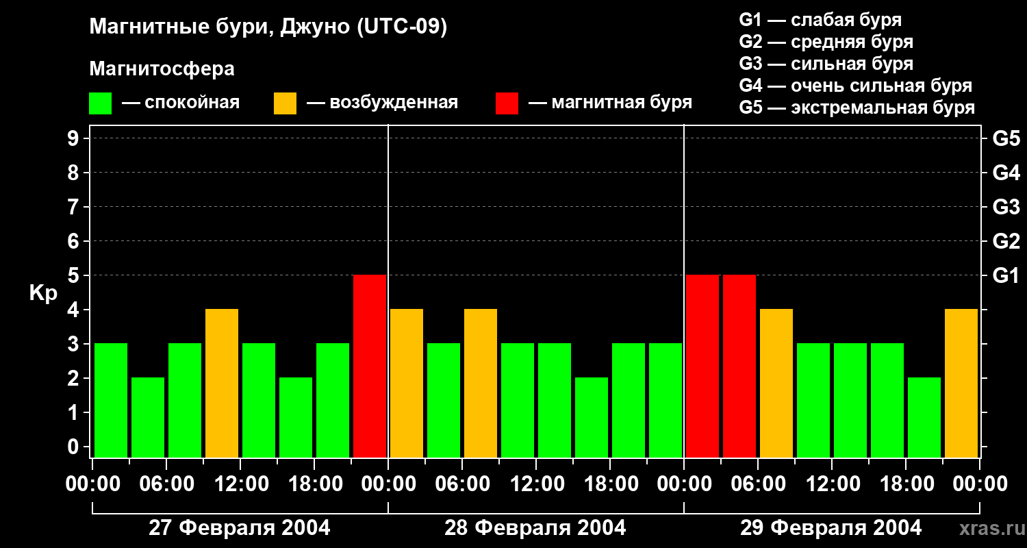 Изменения геомагнитного индекса Kp с 27 по 29 февраля 2004 года для средних широт