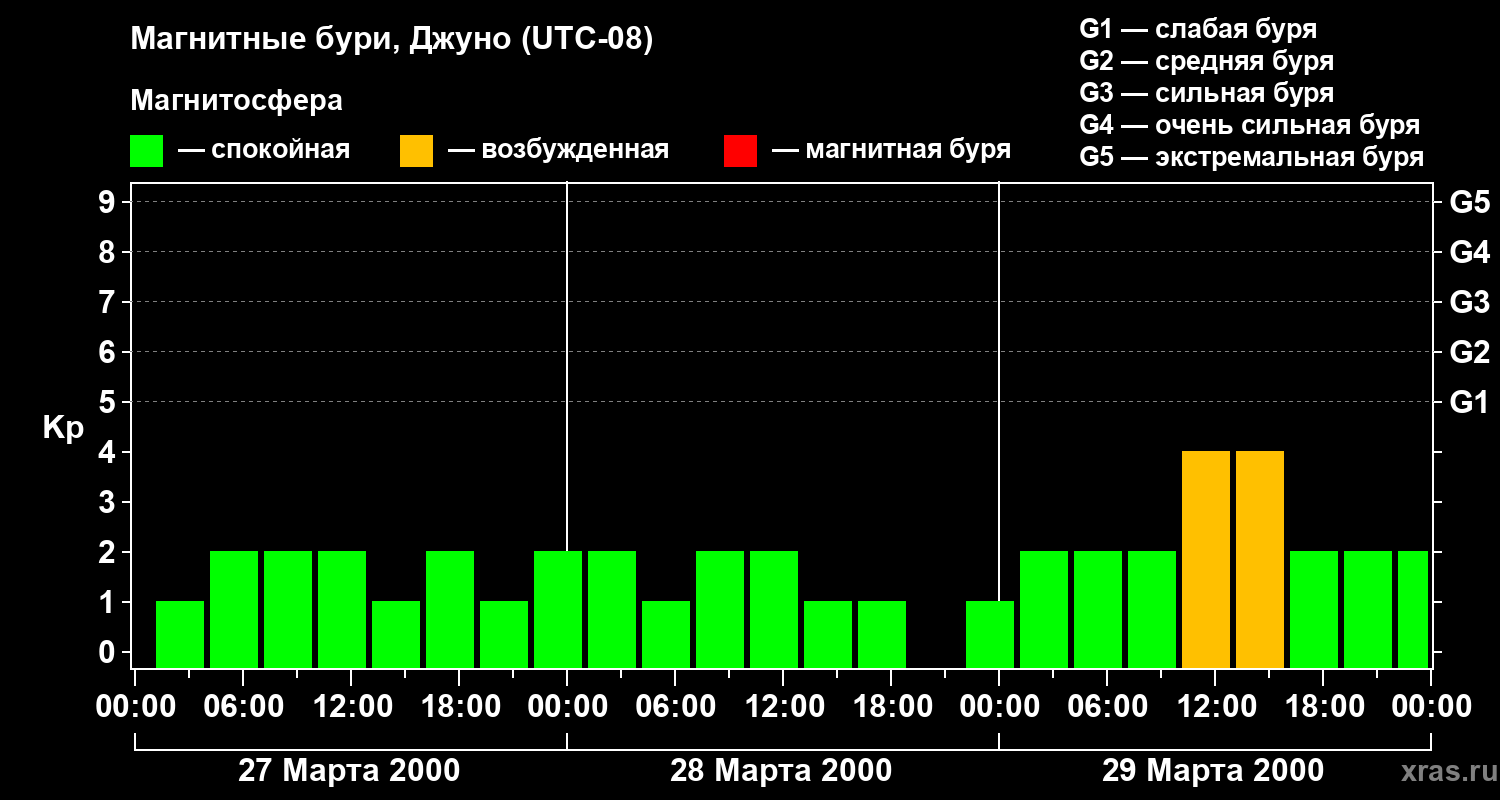 Изменения геомагнитного индекса Kp с 27 по 29 марта 2000 года для средних широт