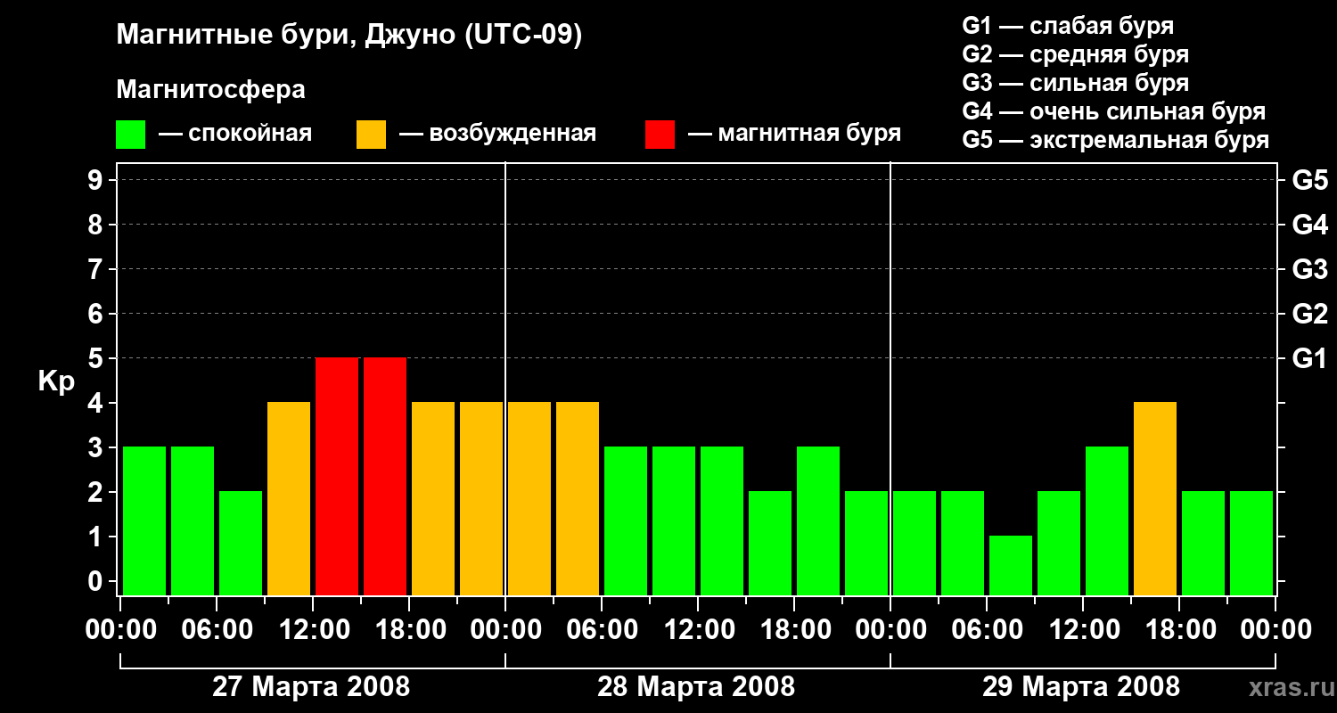 Изменения геомагнитного индекса Kp с 27 по 29 марта 2008 года для средних широт