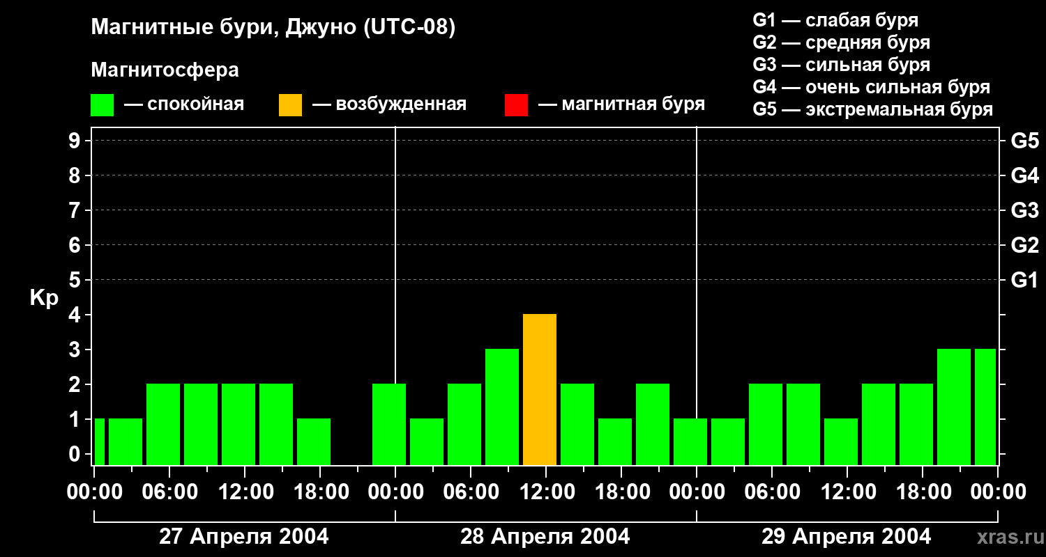 Изменения геомагнитного индекса Kp с 27 по 29 апреля 2004 года для средних широт