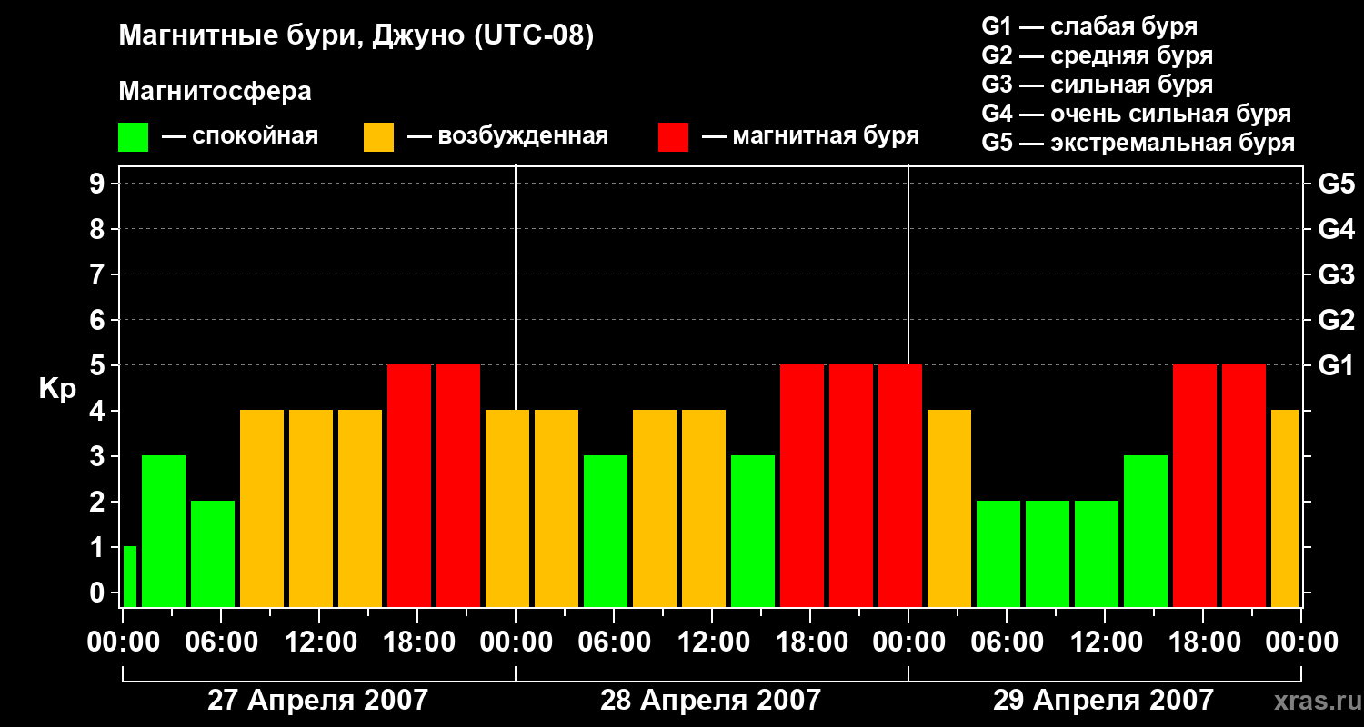 Изменения геомагнитного индекса Kp с 27 по 29 апреля 2007 года для средних широт