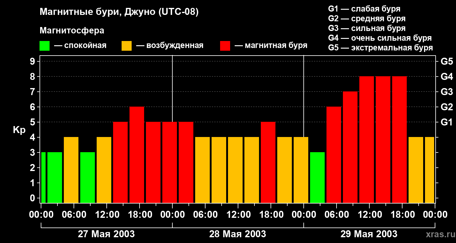 Изменения геомагнитного индекса Kp с 27 по 29 мая 2003 года для средних широт