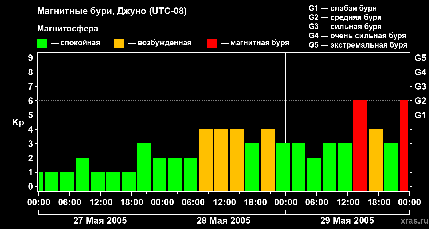 Изменения геомагнитного индекса Kp с 27 по 29 мая 2005 года для средних широт