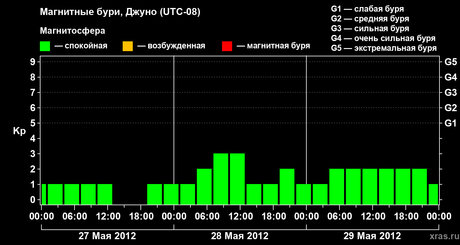 Изменения геомагнитного индекса Kp с 27 по 29 мая 2012 года для средних широт