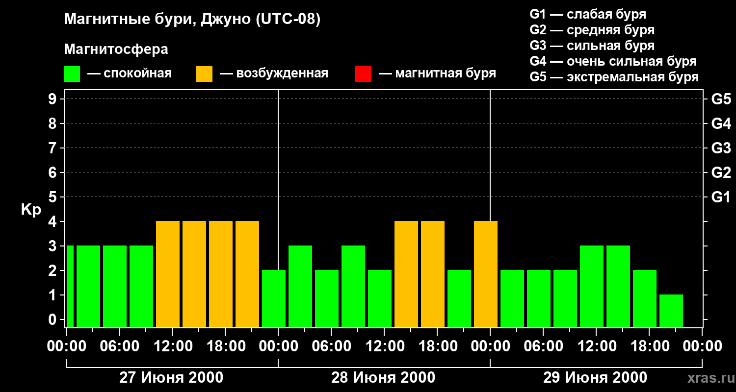Изменения геомагнитного индекса Kp с 27 по 29 июня 2000 года для средних широт