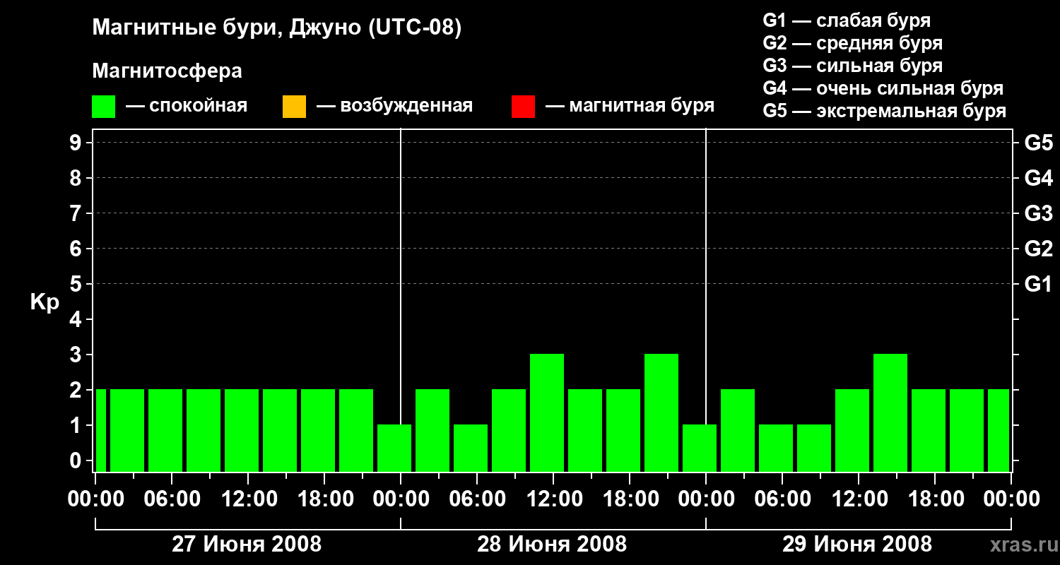 Изменения геомагнитного индекса Kp с 27 по 29 июня 2008 года для средних широт