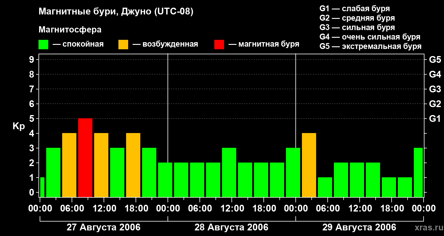 Изменения геомагнитного индекса Kp с 27 по 29 августа 2006 года для средних широт