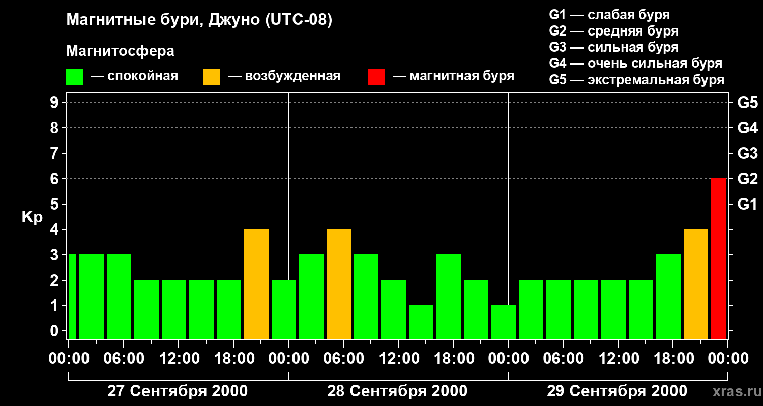 Изменения геомагнитного индекса Kp с 27 по 29 сентября 2000 года для средних широт