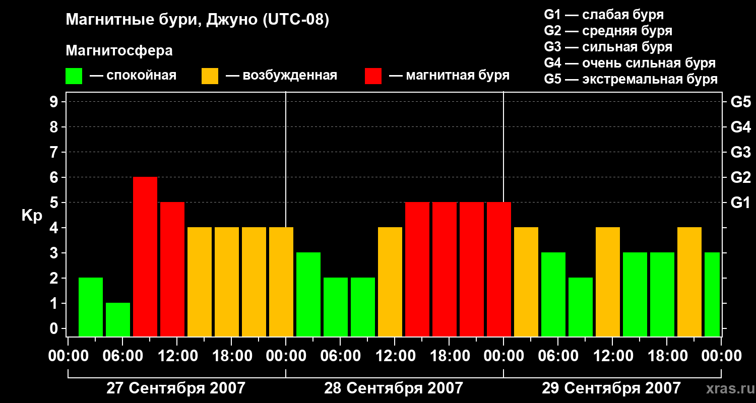 Изменения геомагнитного индекса Kp с 27 по 29 сентября 2007 года для средних широт