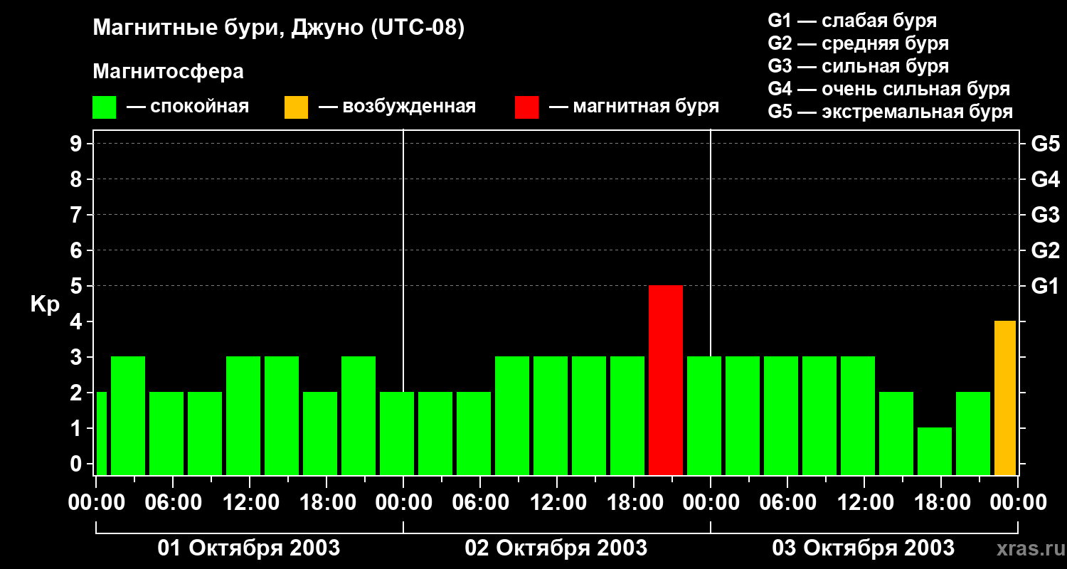 Изменения геомагнитного индекса Kp с 1 по 3 октября 2003 года для средних широт