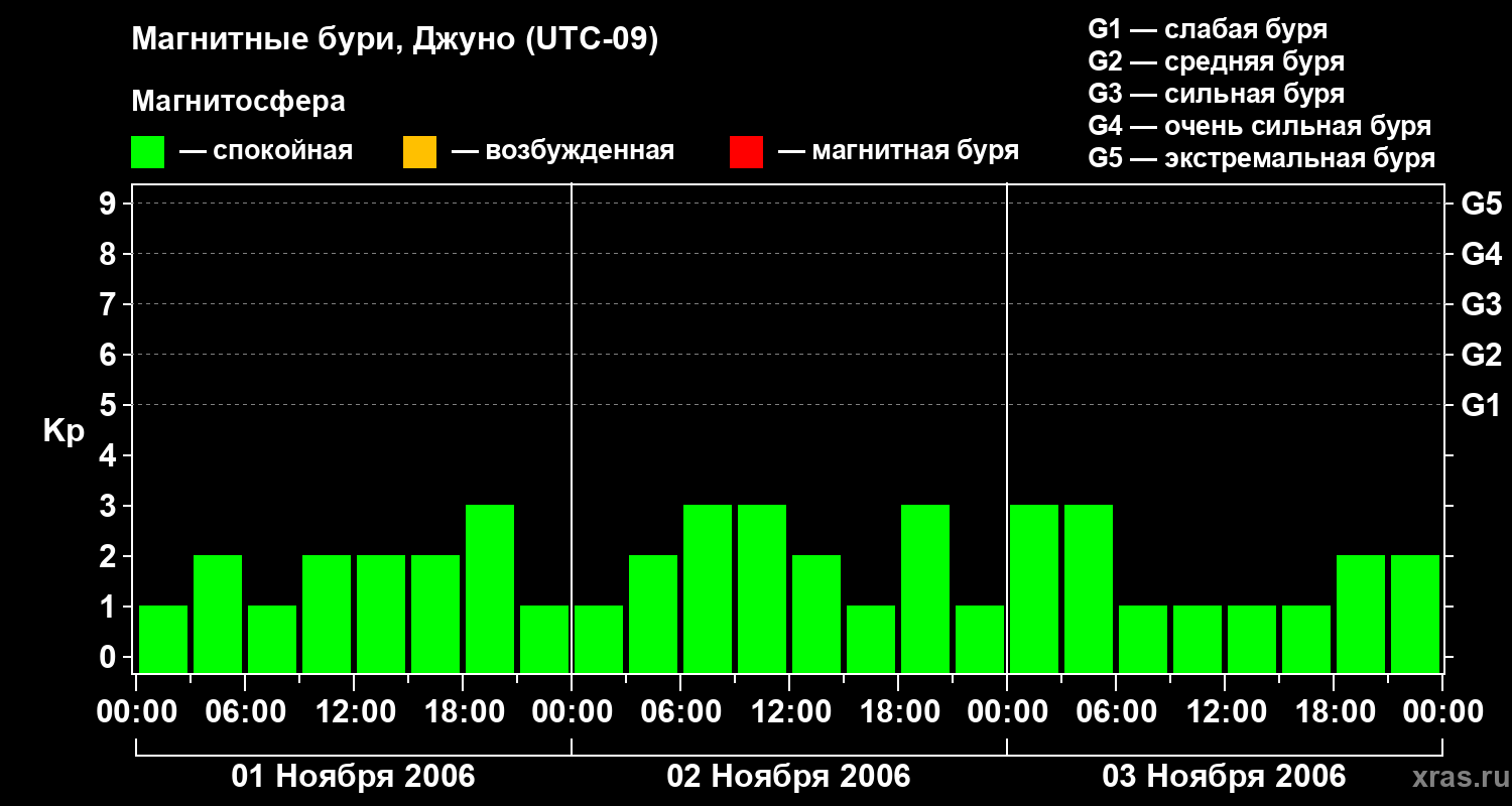 Изменения геомагнитного индекса Kp с 1 по 3 ноября 2006 года для средних широт