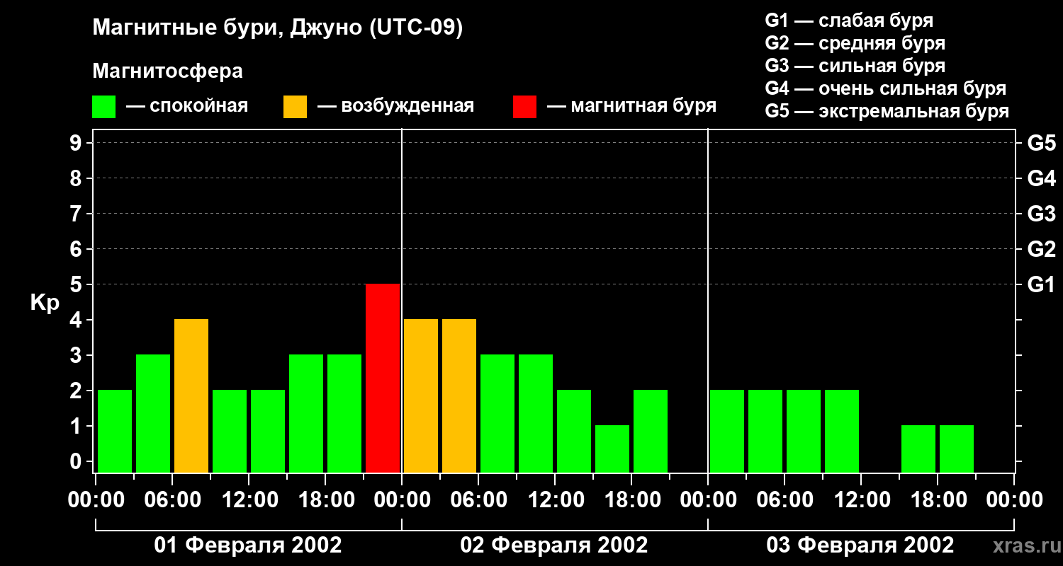 Изменения геомагнитного индекса Kp с 1 по 3 февраля 2002 года для средних широт
