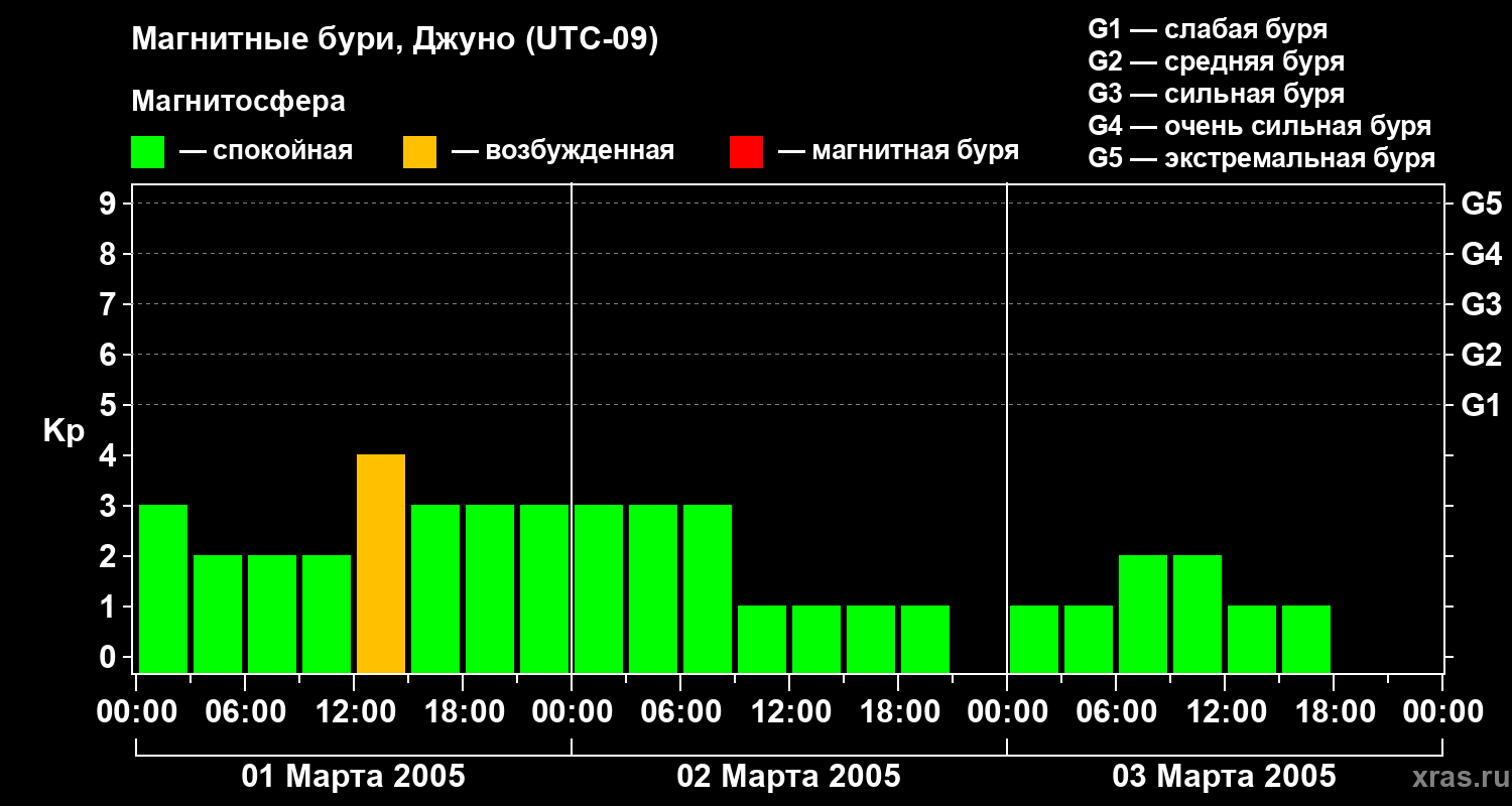 Изменения геомагнитного индекса Kp с 1 по 3 марта 2005 года для средних широт