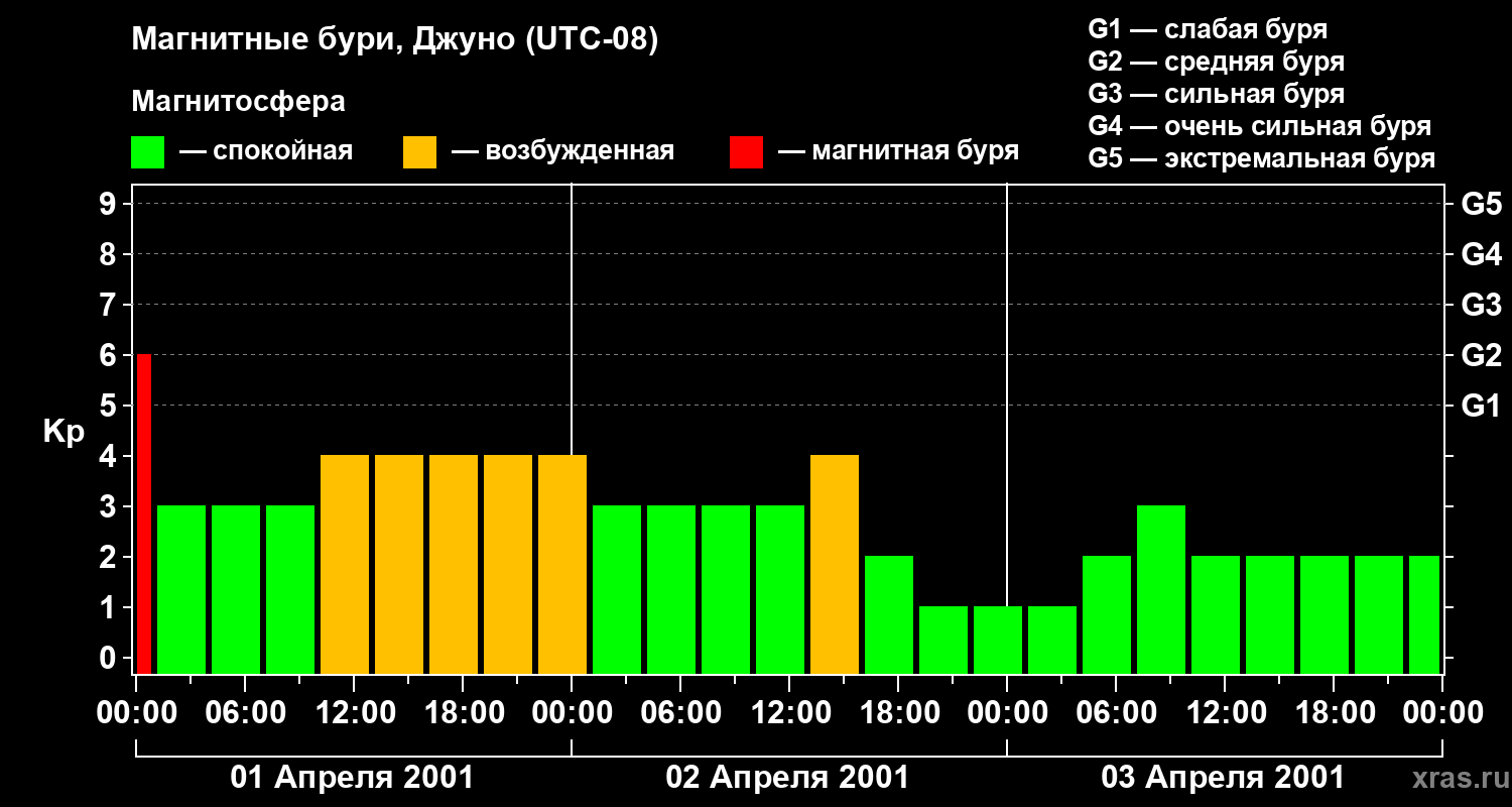 Изменения геомагнитного индекса Kp с 1 по 3 апреля 2001 года для средних широт