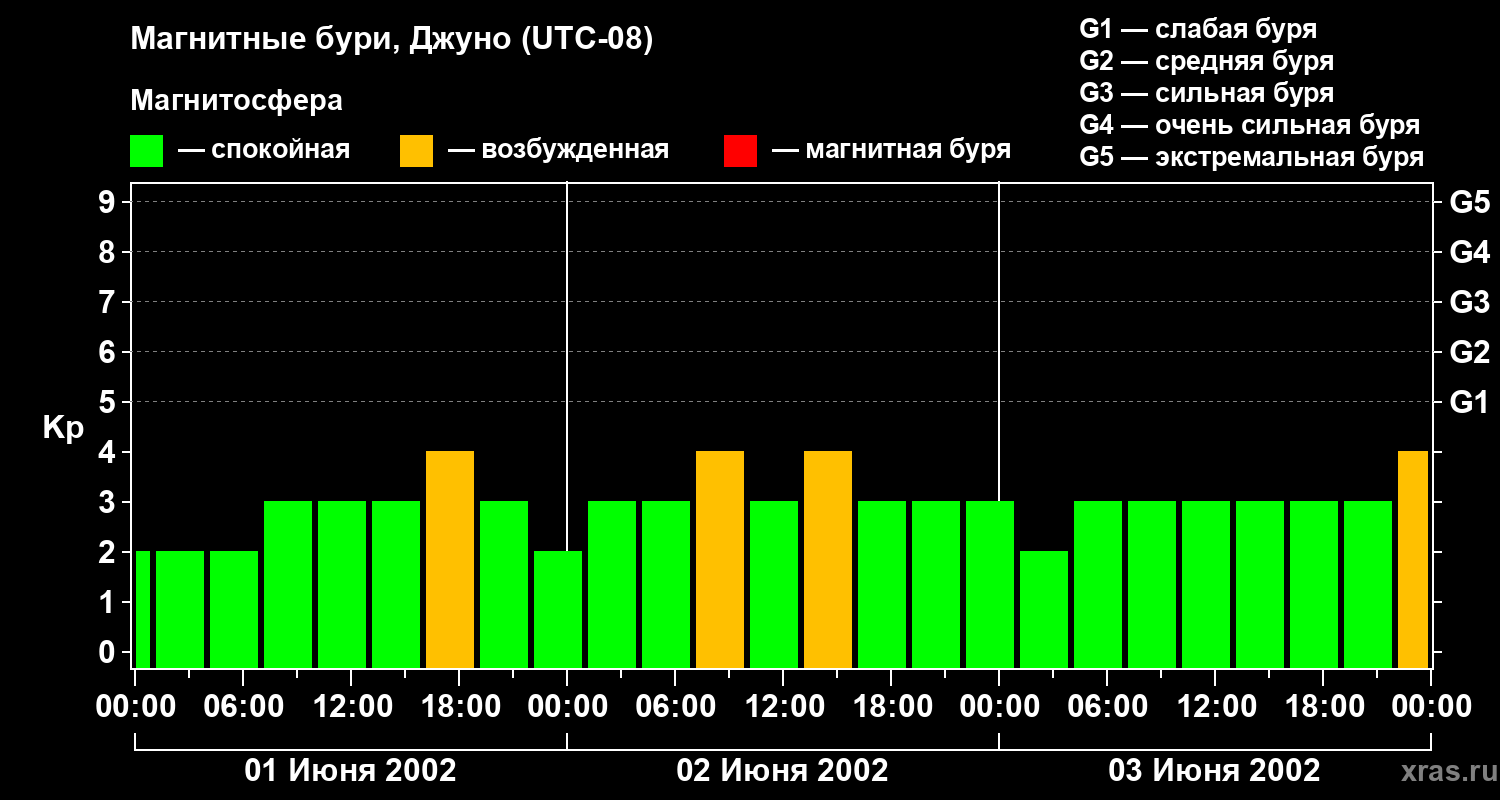 Изменения геомагнитного индекса Kp с 1 по 3 июня 2002 года для средних широт