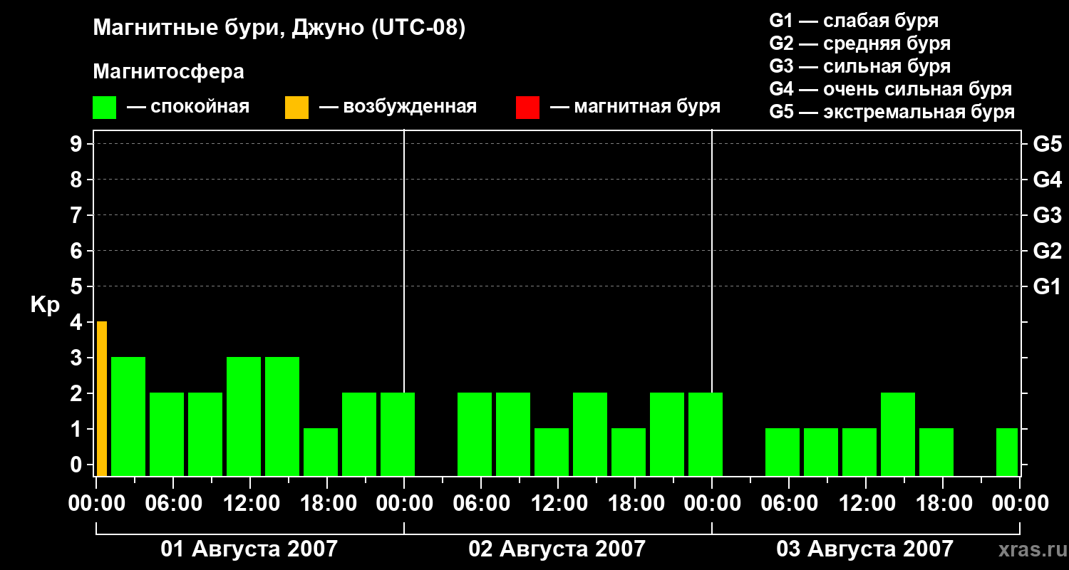 Изменения геомагнитного индекса Kp с 1 по 3 августа 2007 года для средних широт