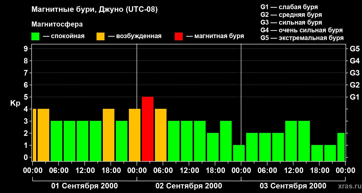 Изменения геомагнитного индекса Kp с 1 по 3 сентября 2000 года для средних широт