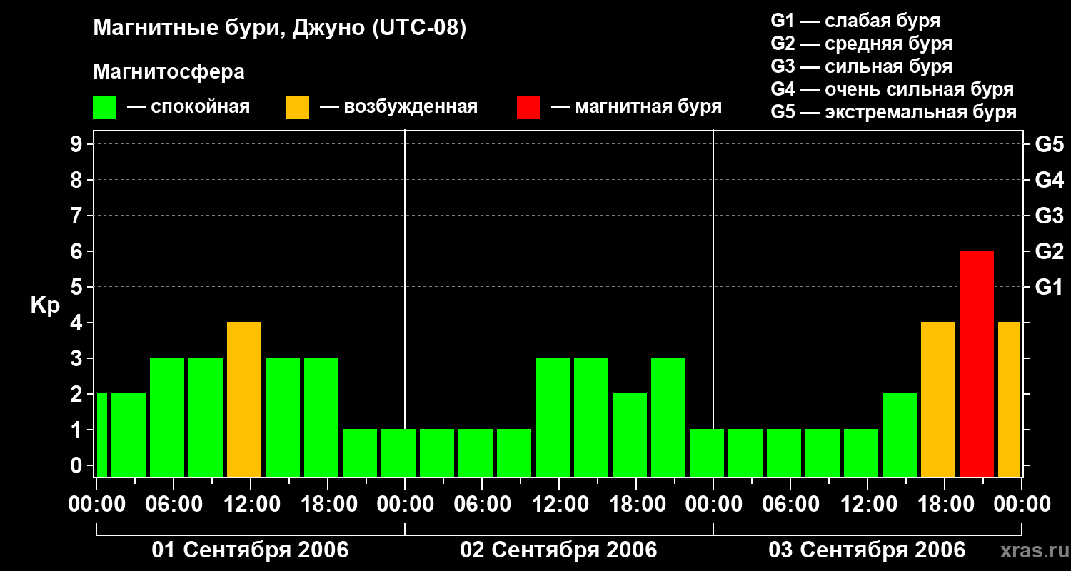 Изменения геомагнитного индекса Kp с 1 по 3 сентября 2006 года для средних широт