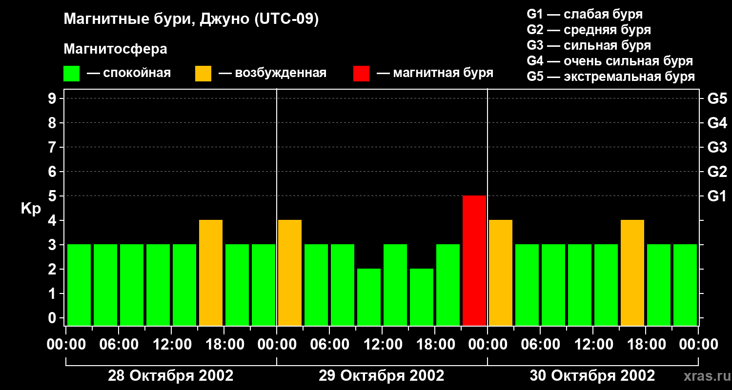Изменения геомагнитного индекса Kp с 28 по 30 октября 2002 года для средних широт
