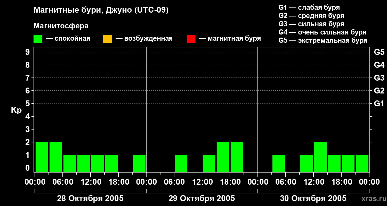 Изменения геомагнитного индекса Kp с 28 по 30 октября 2005 года для средних широт