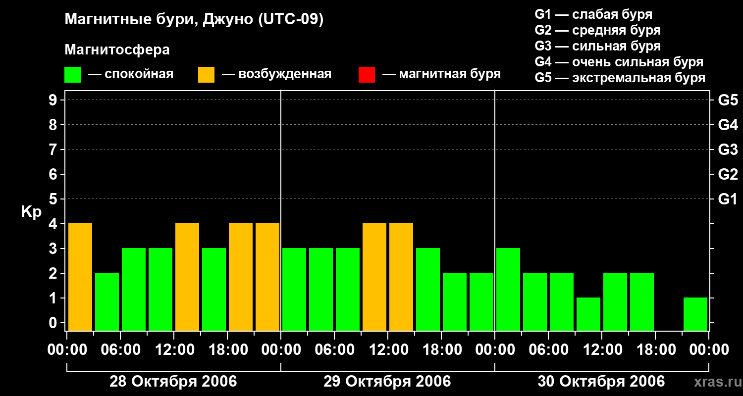 Изменения геомагнитного индекса Kp с 28 по 30 октября 2006 года для средних широт