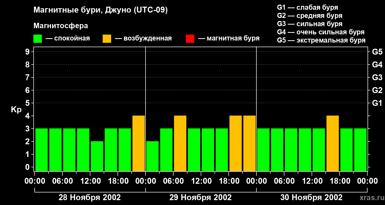 Изменения геомагнитного индекса Kp с 28 по 30 ноября 2002 года для средних широт