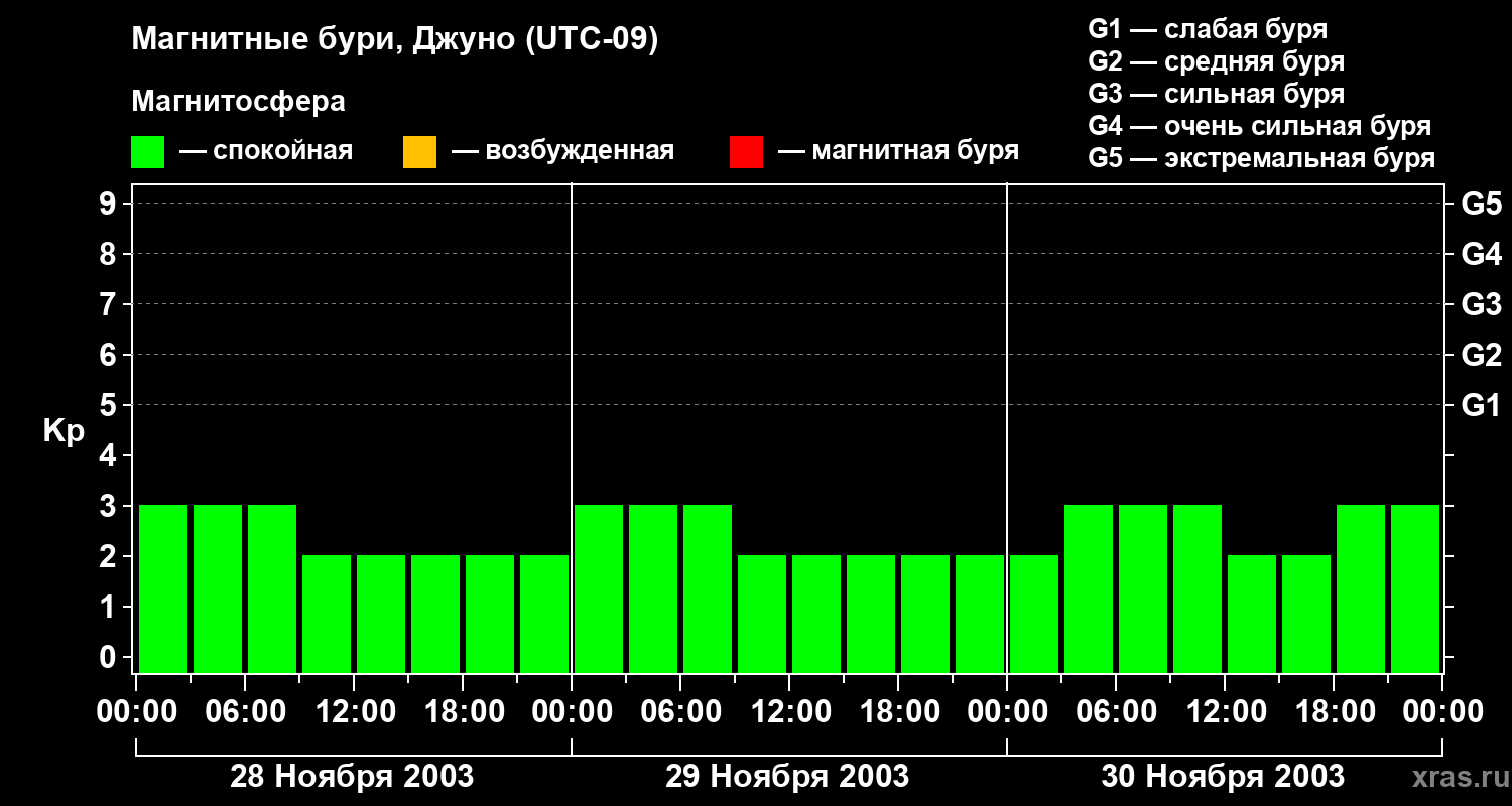 Изменения геомагнитного индекса Kp с 28 по 30 ноября 2003 года для средних широт